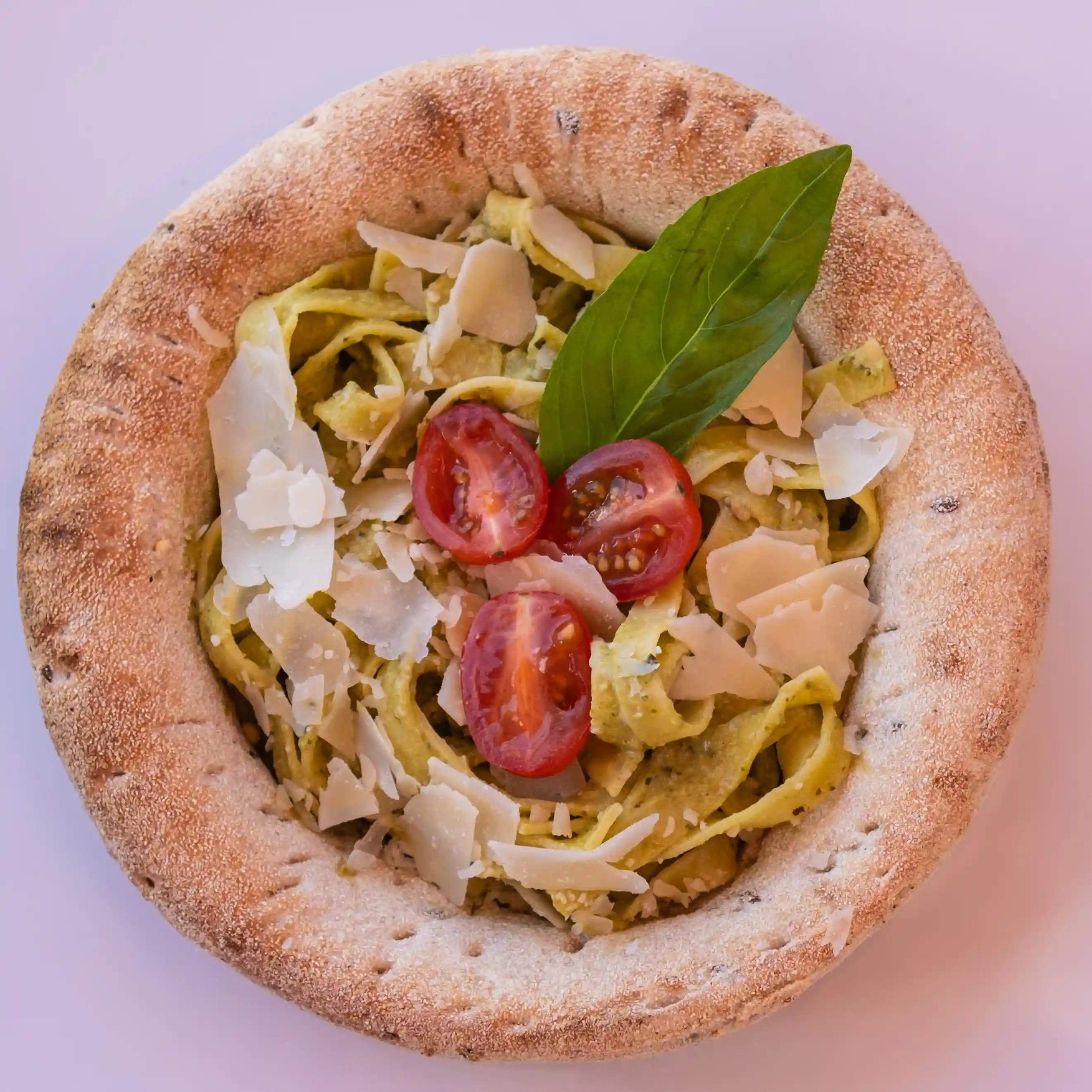 Tasty tagliatelle served in a crispy pizza dough bowl, Chef's basil pesto, Cherry tomatoes, Basil leaves, Parmesan shav…
