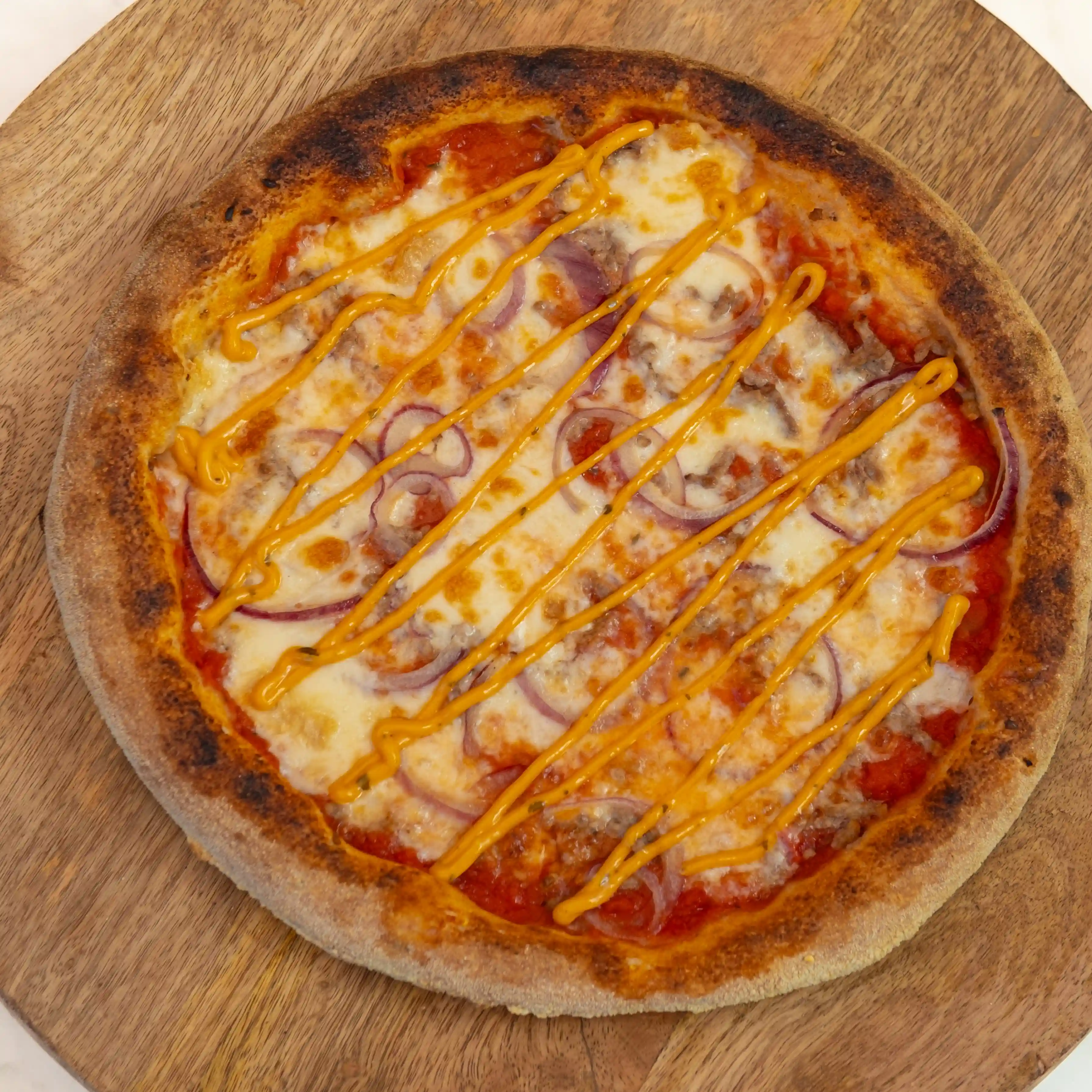 Tomato sauce, Mozzarella, Minced meat, Red onions, Taleggio cheese