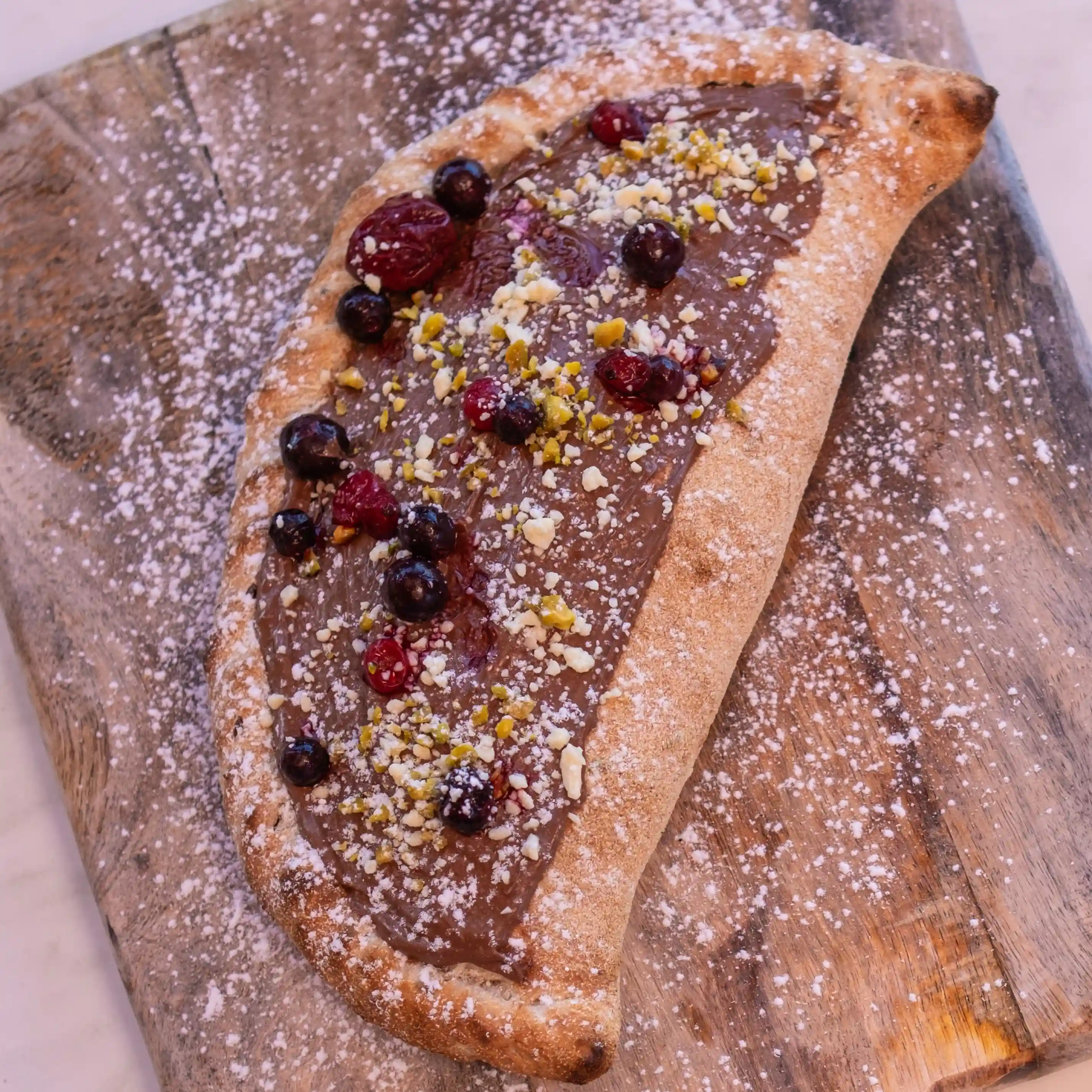 Nutella, Strawberries, Raspberries, Blueberries, Grated white chocolate, Icing sugar, Pistachio chips