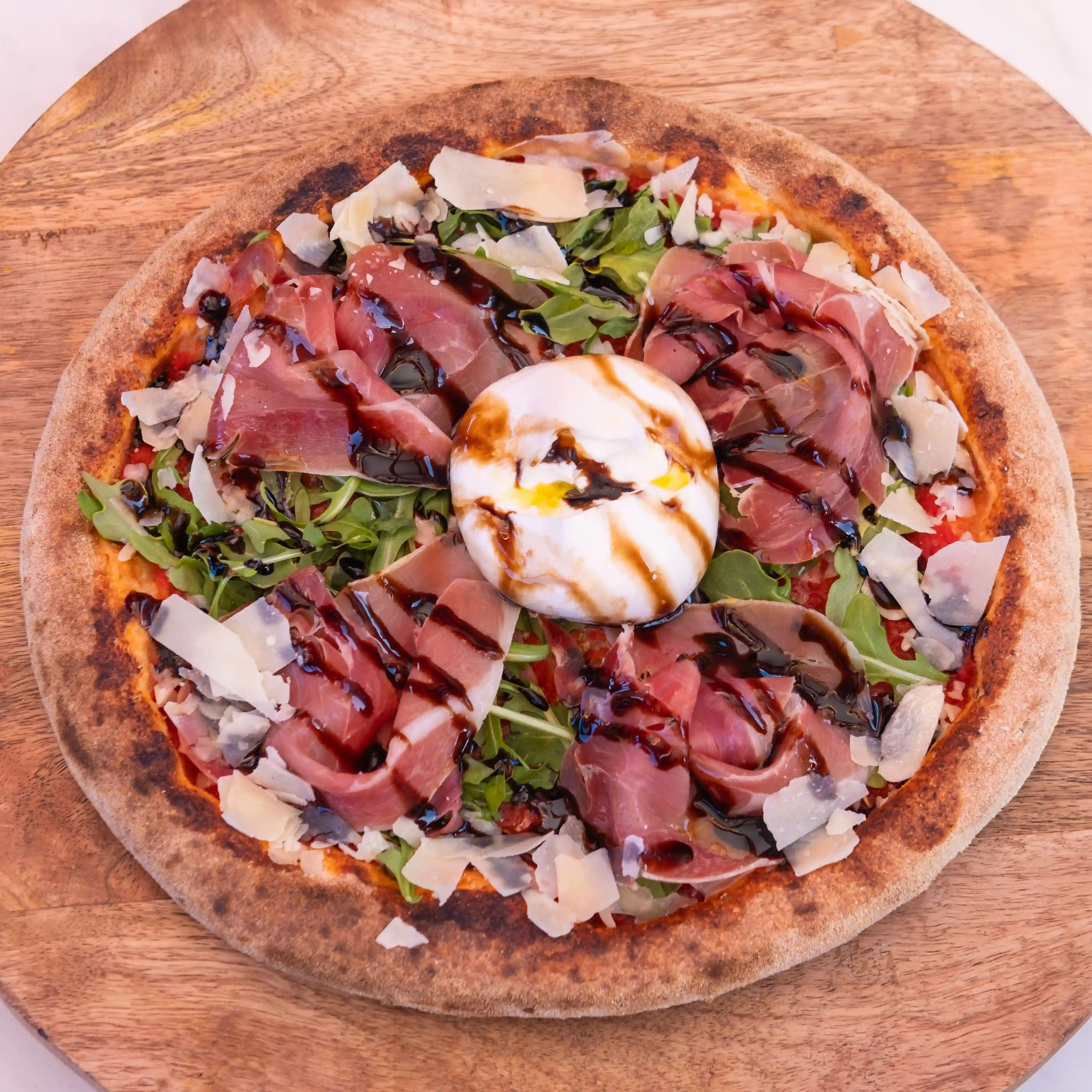 Tomato sauce, Oregano, After cooking: arugula, Prosciutto crudo ham, Burrata (125g), Fillet of extra virgin olive oil