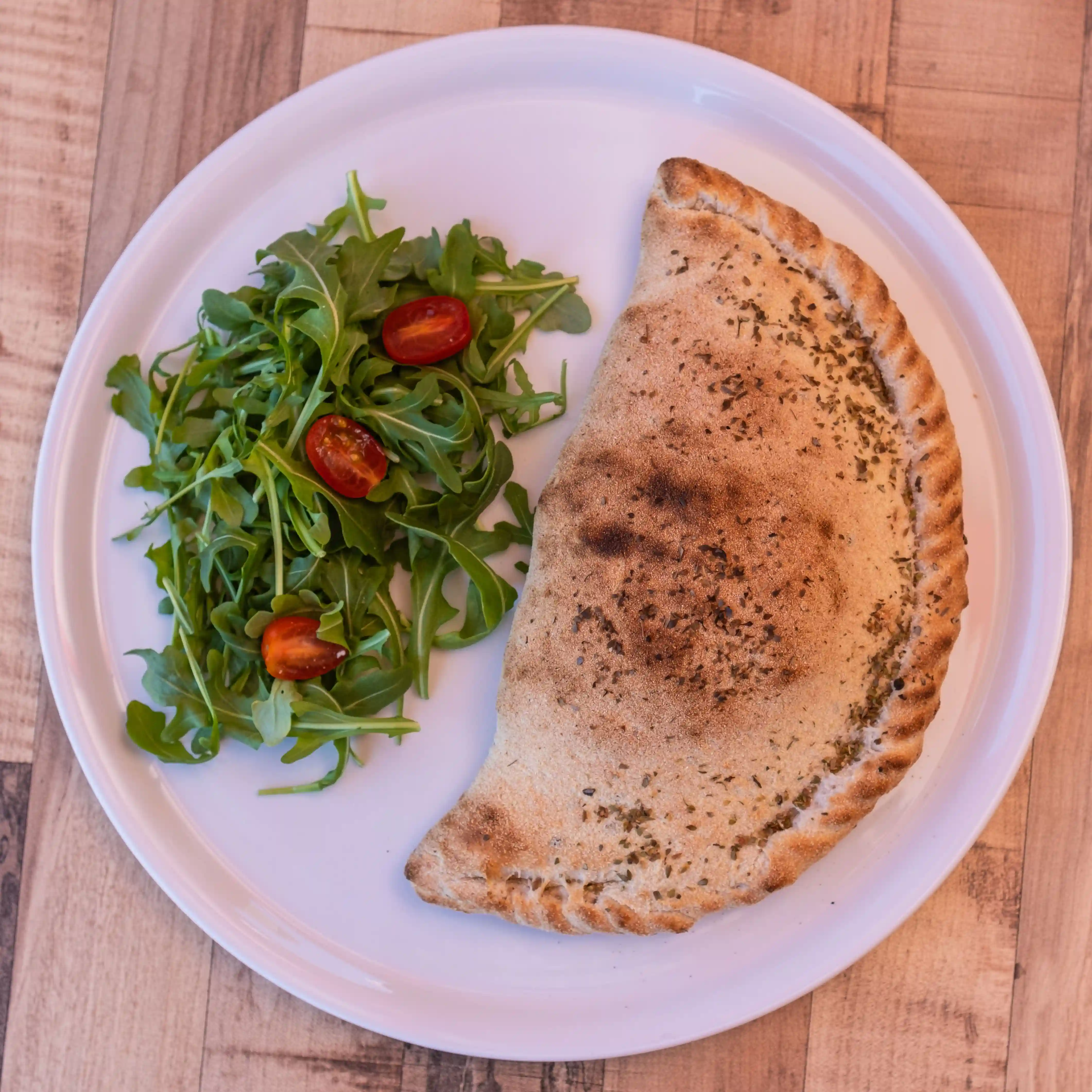 Tomato sauce, Mozzarella, Eggplant, Roasted peppers, After cooking: Arugula, Parmesan, Extra virgin olive oil drizzle