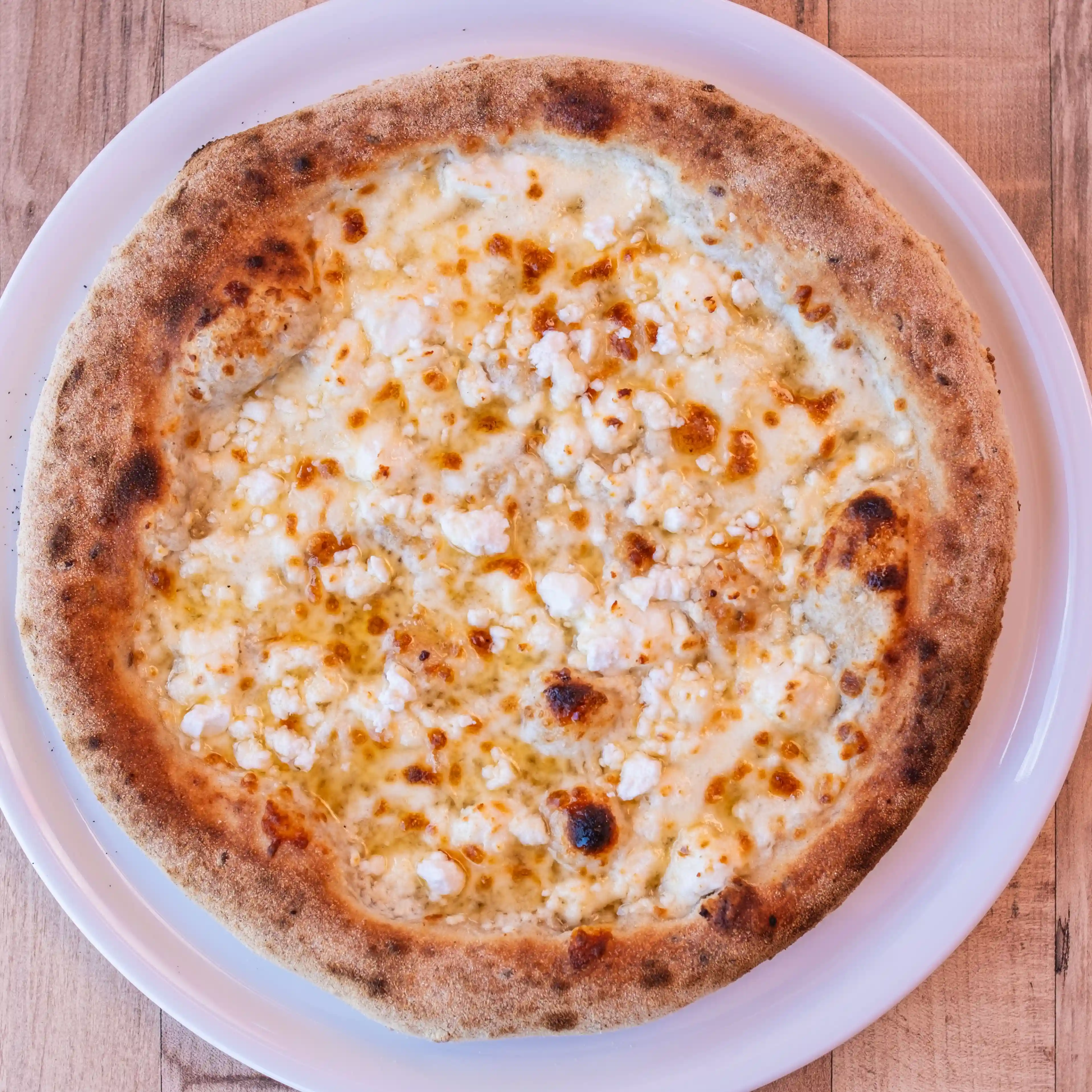 Crème fraîche, Mozzarella, Oregano, After cooking: Crumbled goat cheese, Honey