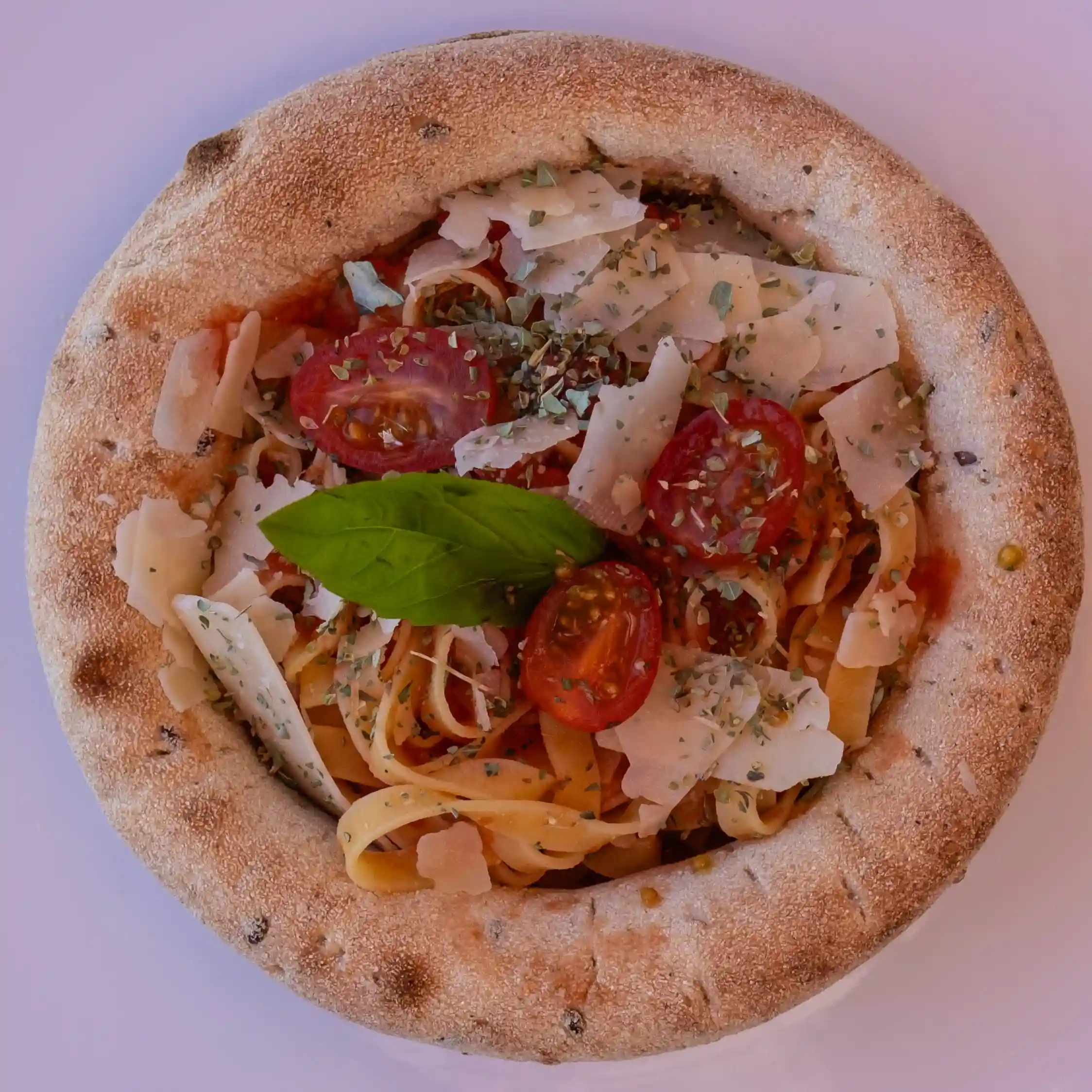 Tasty tagliatelle served in a crispy pizza dough bowl, Chef's sauce, Parmesan shavings, Basil, Oregano