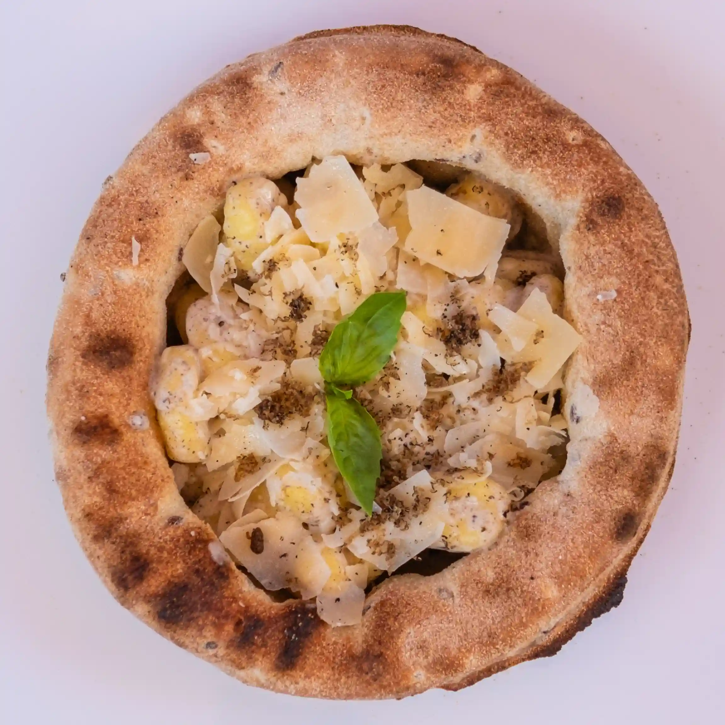 Tasty gnocchi served in a crispy pizza dough bowl, Chef's truffle cream, grated truffle, basil leaves, Parmesan shaving…
