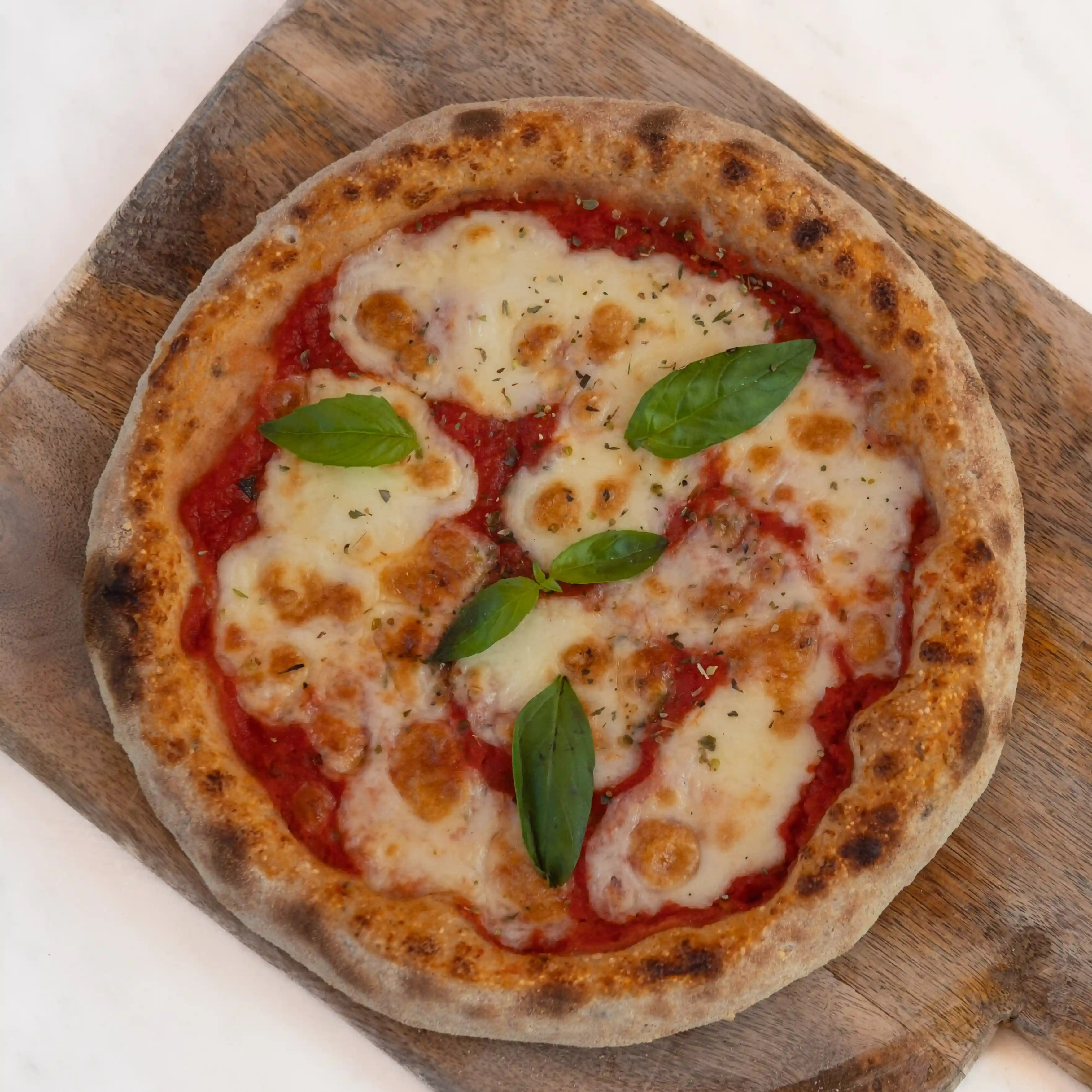 Tomato sauce, mozzarella fior di latte, Basil, After cooking: Oregano, Extra virgin olive oil drizzle