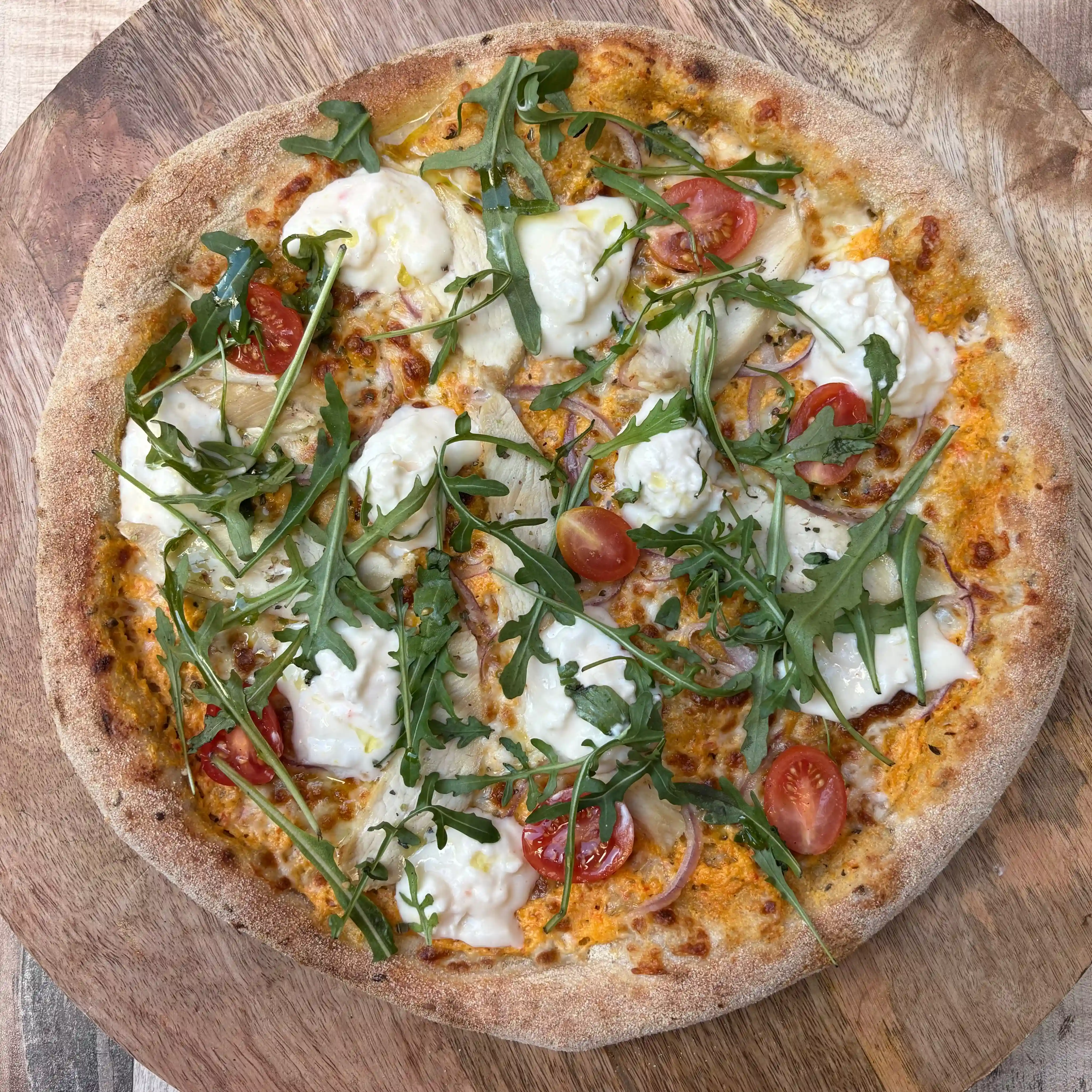 Cream of peppers, Mozzarella, Chicken, Red onions, After cooking: Burratta tip, Cherry tomatoes, Arugula, Extra virgin…