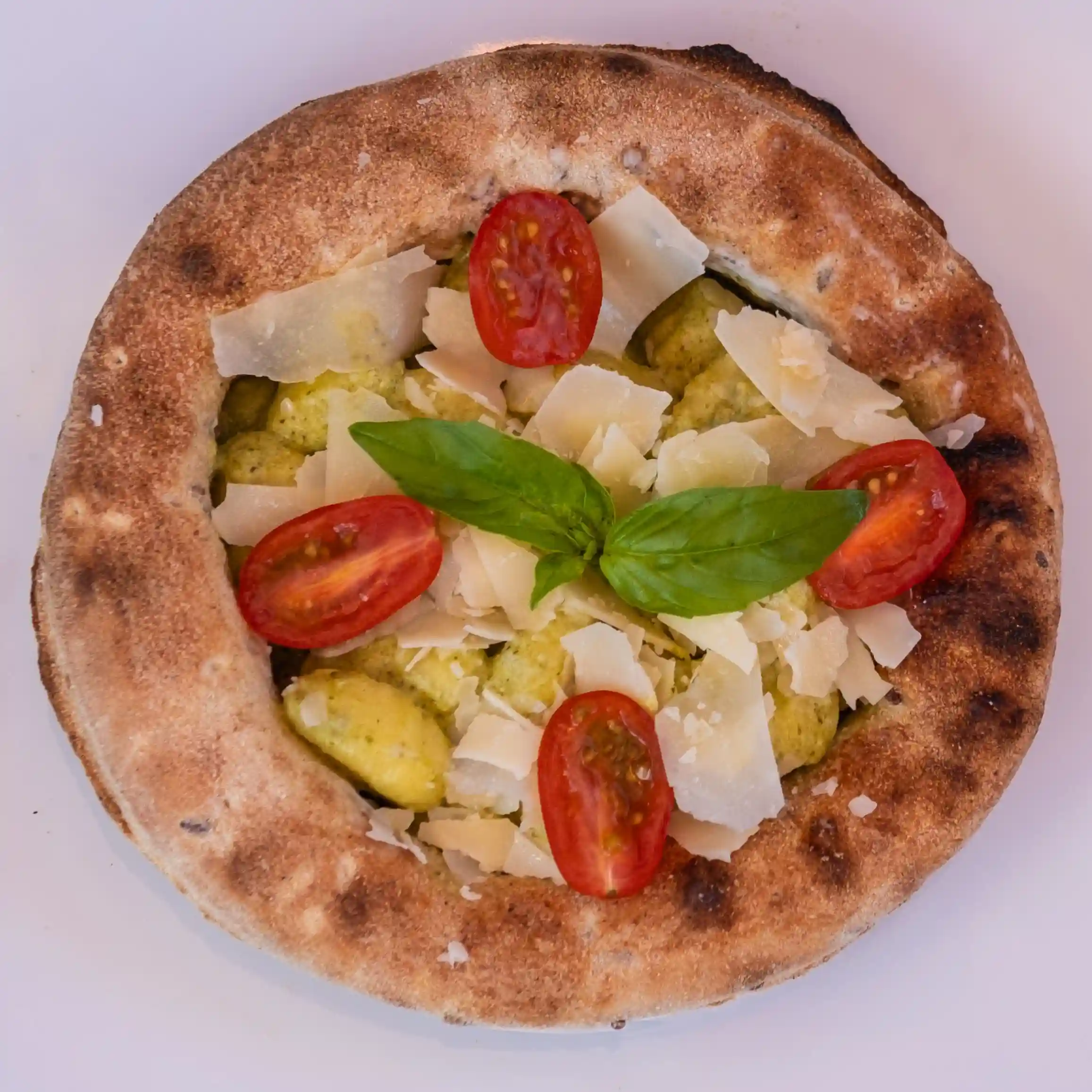 Tasty gnocchi served in a pizza dough bowl, Basil pesto, Cherry tomatoes, Basil leaves, Parmesan shavings