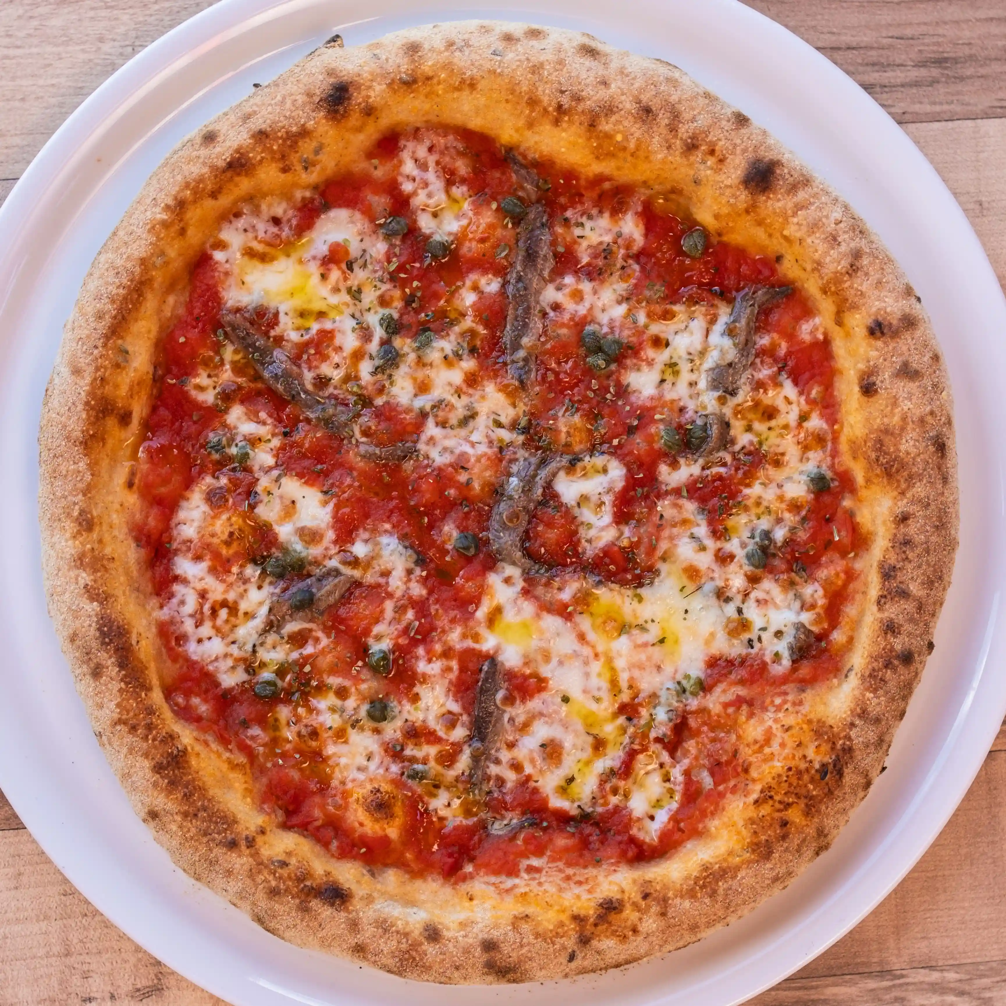 Tomato sauce, Mozzarella, Anchovies, After cooking: Kalamata olives
