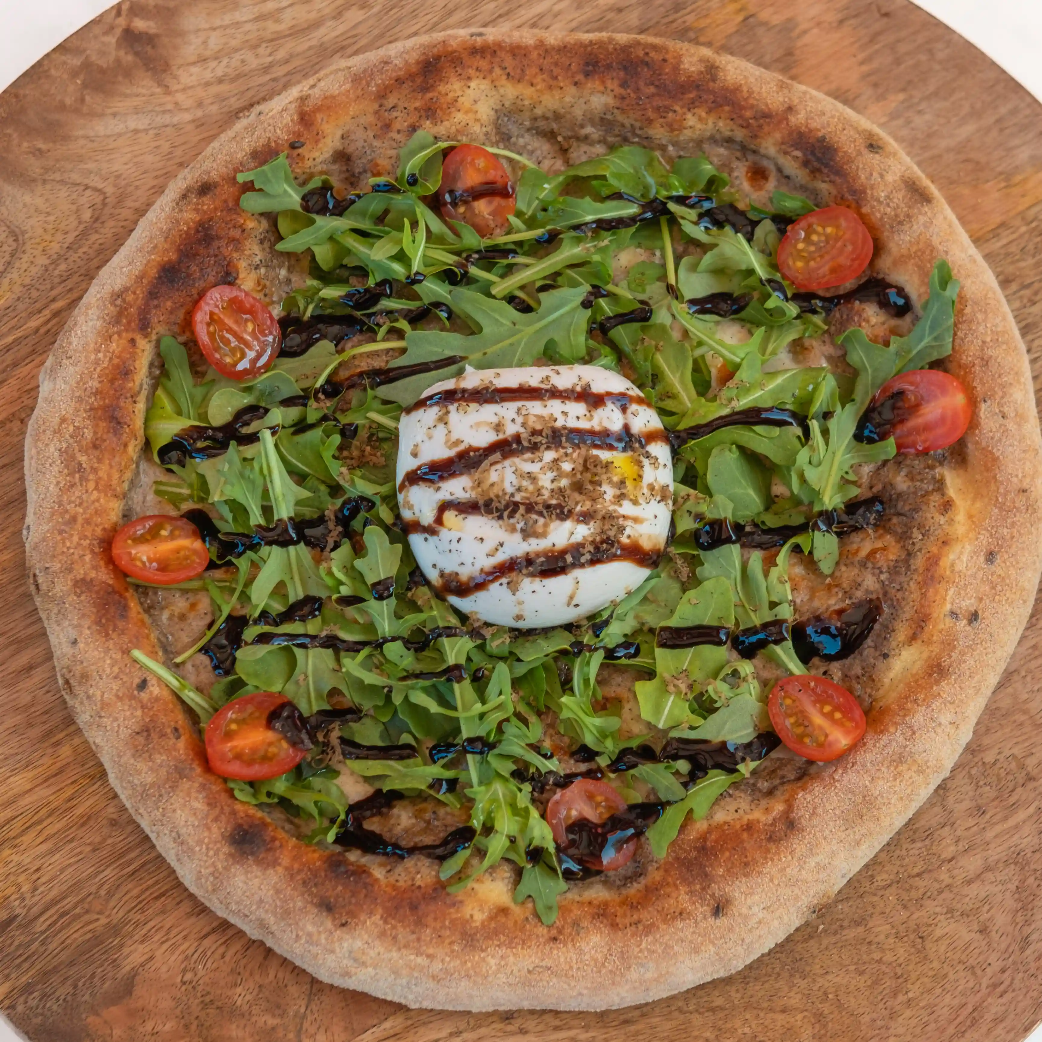 Truffle cream, Mozzarella, After cooking: Arugula, Burrata (125g), Cherry tomatoes, Parmesan shavings, White truffle ba…