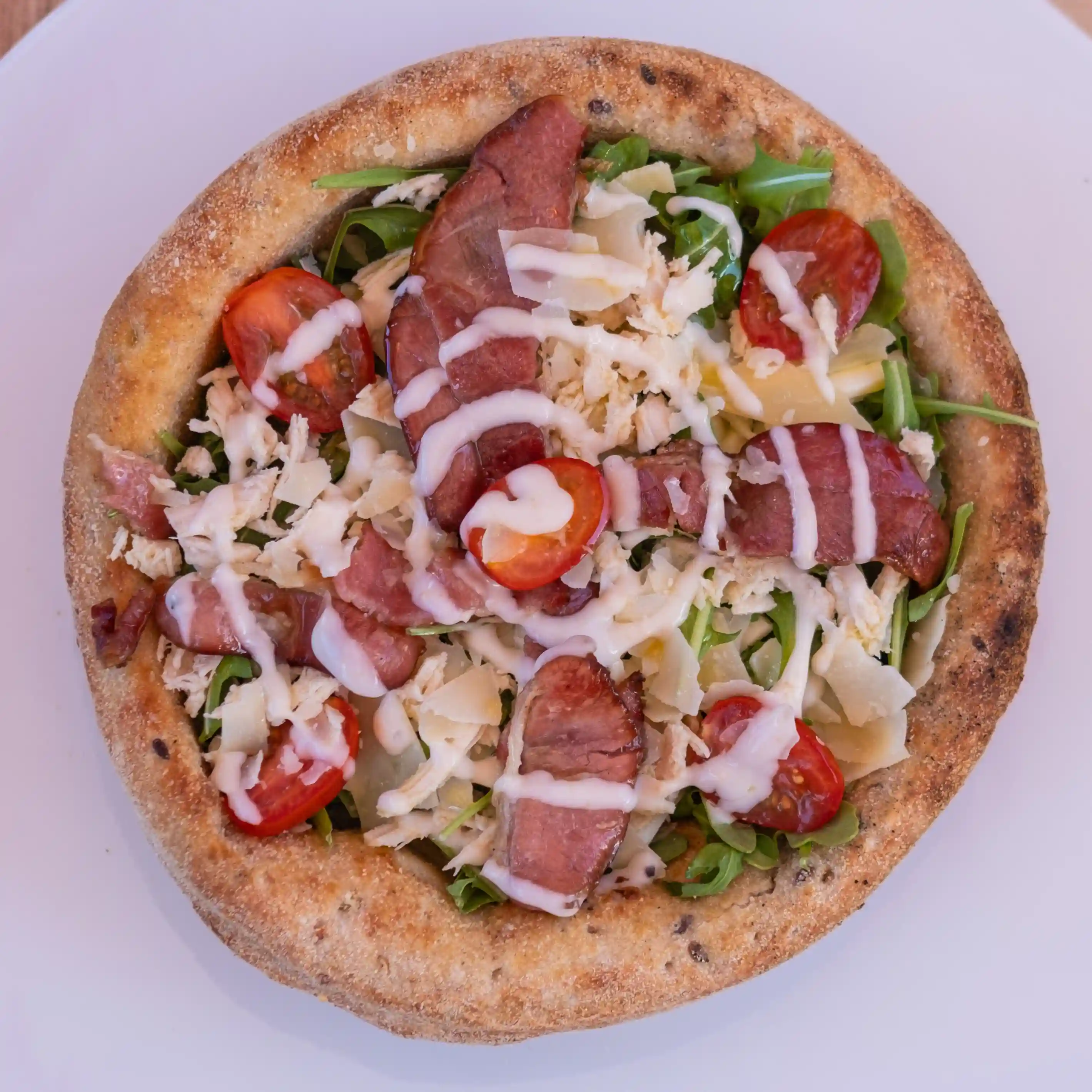 A gourmet salad served in a bowl of crispy pizza dough, Arugula, Mozzarella, Grilled bacon, Cherry tomatoes, Parmesan s…