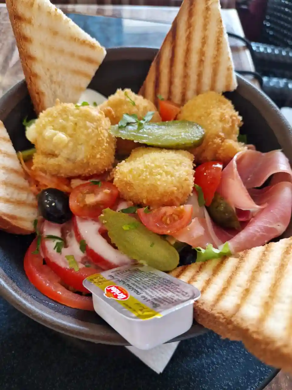 Salad, Tomatoes Carrots, Corn, Hard-boiled egg, Brie pane, Italian ham,