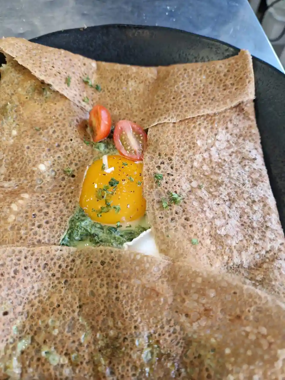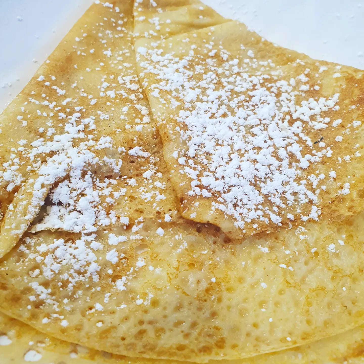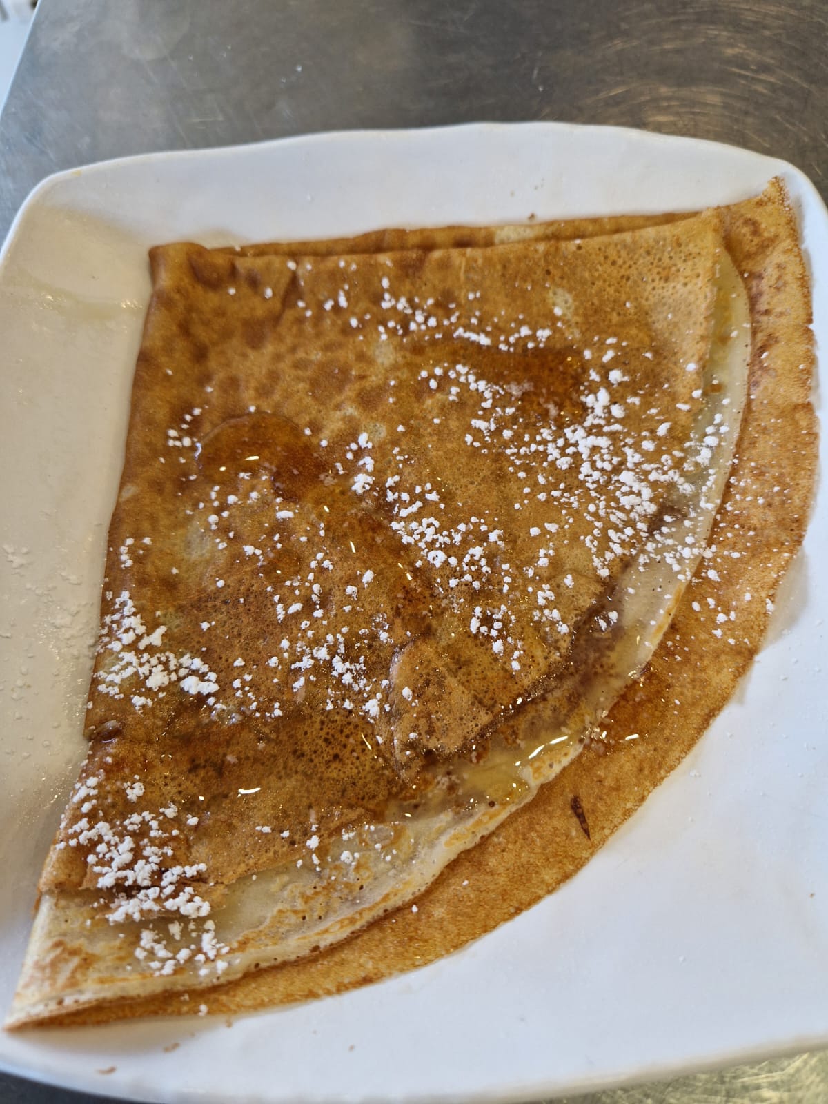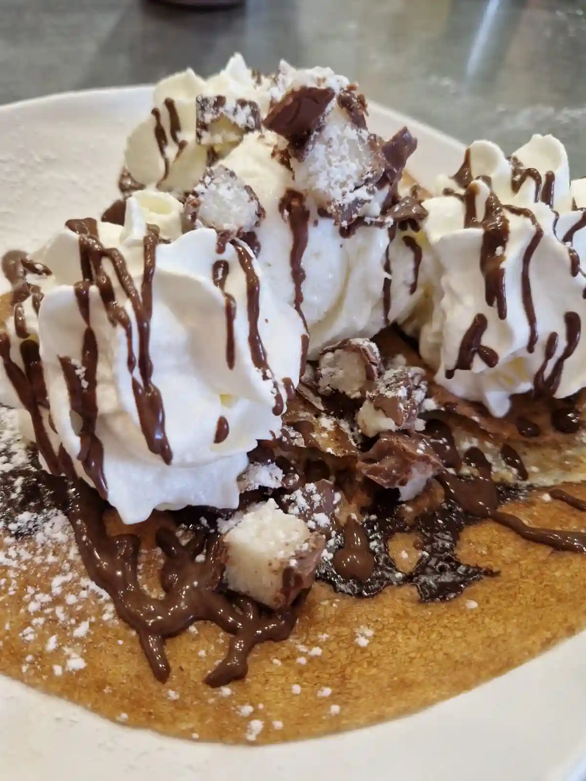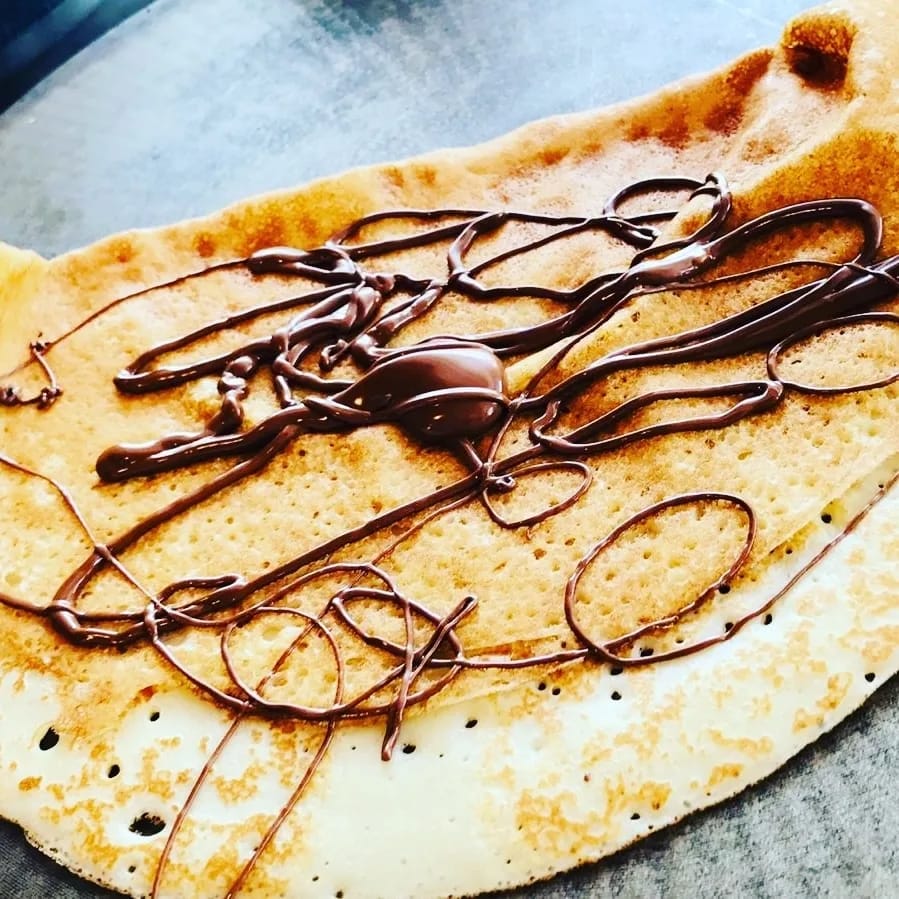 Crepe with chocolate sauce and caramelized crêpe dentelle