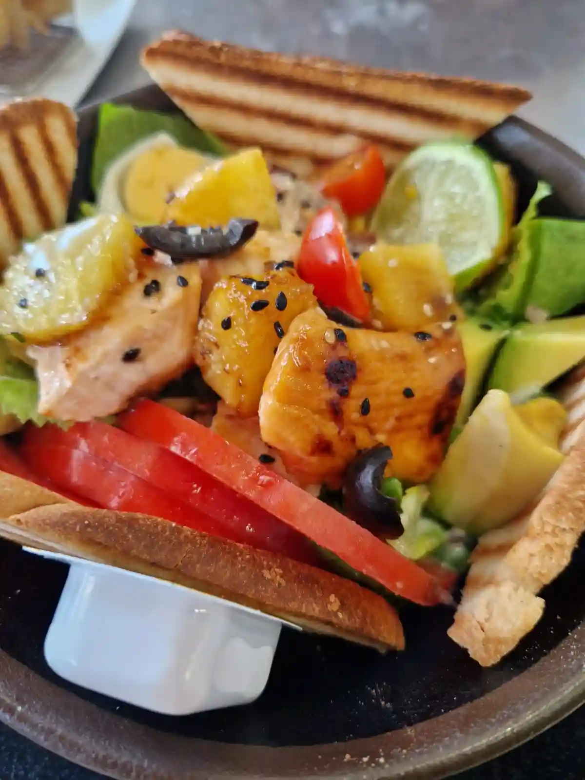 Salad, Raw Vegetables, Boiled Egg, Smoked Salmon, Avocado, Shrimp Fritter