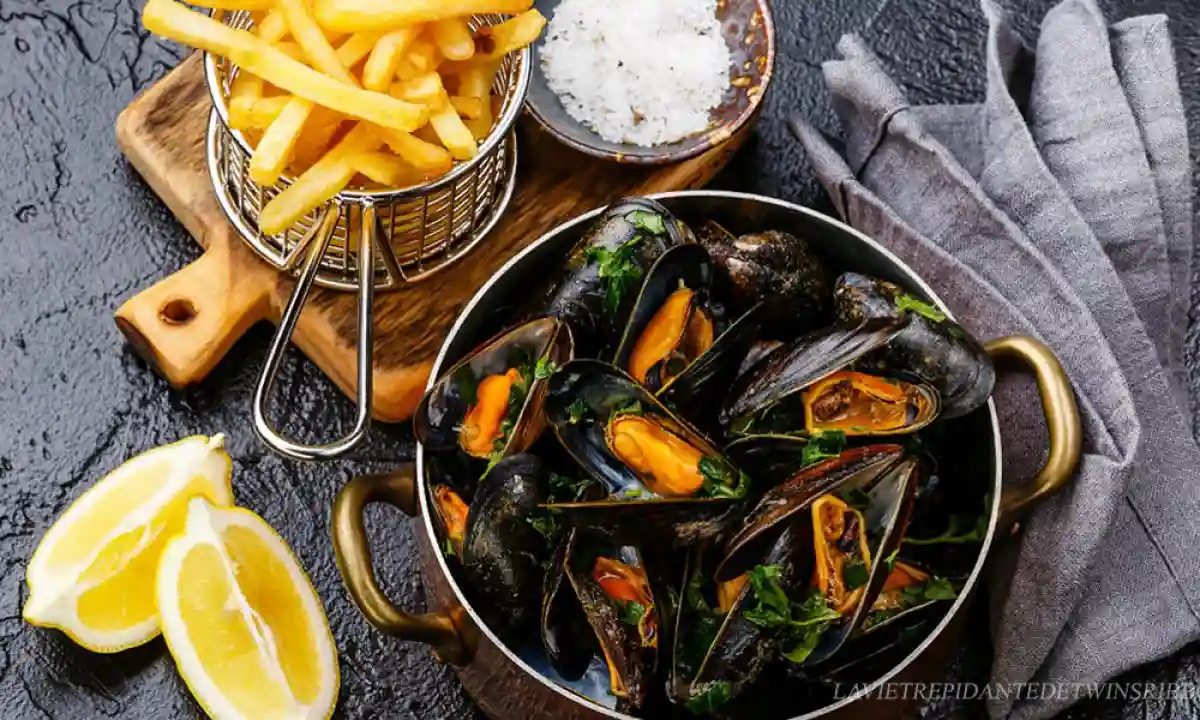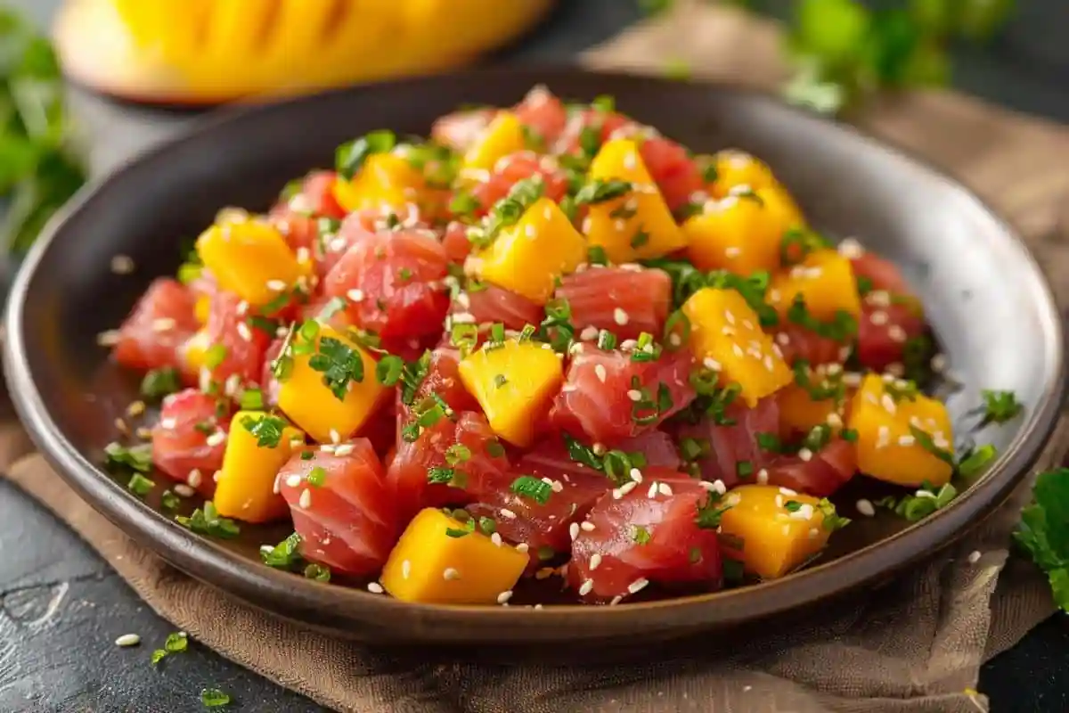 Thon cru dans un jus de citron, Mangue fraîche, Tomates cerises, Servit avec des frites