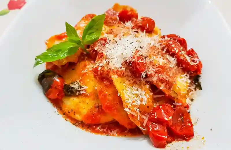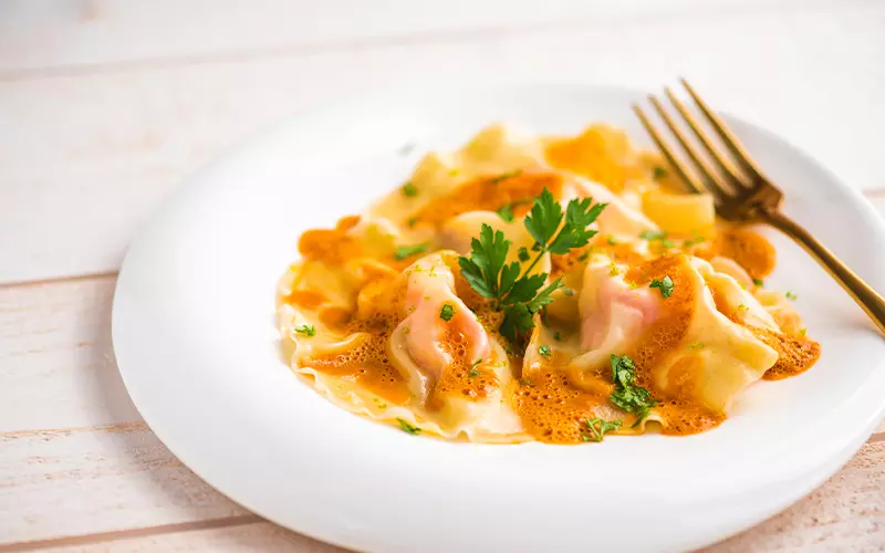 Raviolis en forme de demi-lune garnis de ricotta et d'épinards, servis avec une sauce tomate et parmesan