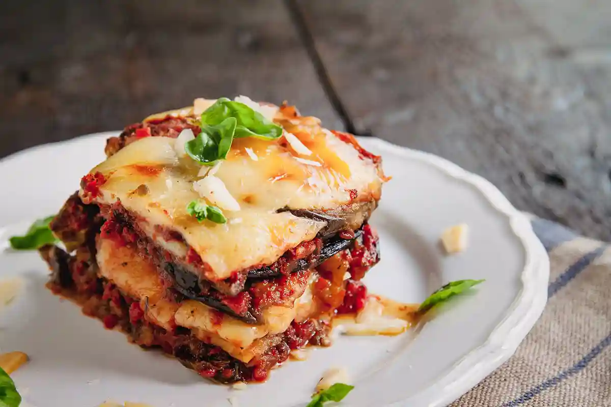 Aubergines grillées en couches avec sauce tomate, mozzarella, parmesan