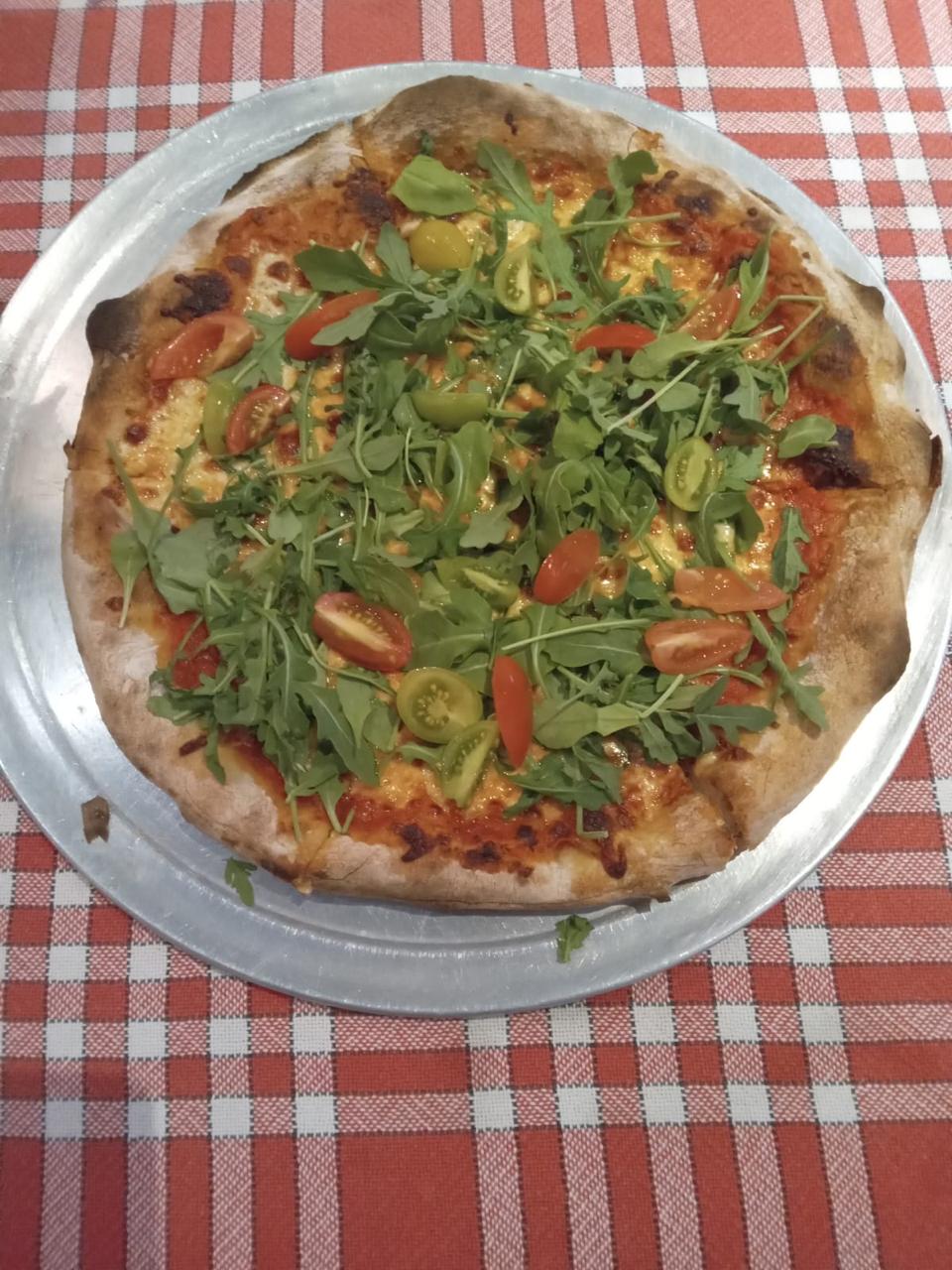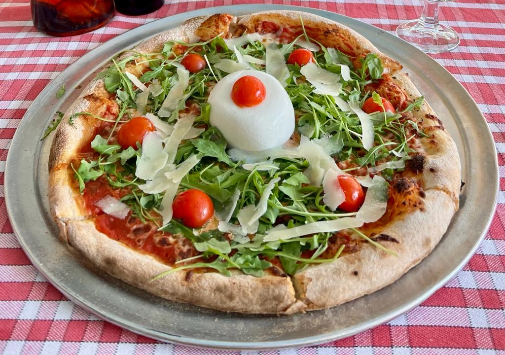 Sauce marinara, Mozzarella, Roquette, Tomates cerises, Burrata, Copeaux de parmesan