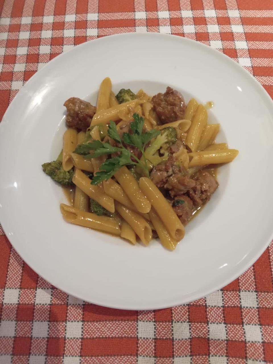 Saucisse italienne cuisinée dans un jus de viande avec brocoli, Agrémenté de parmesan