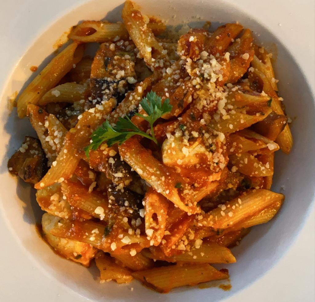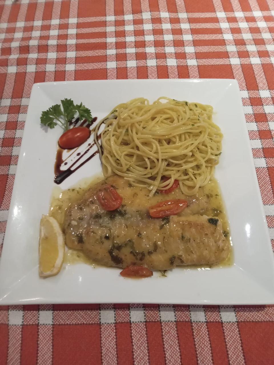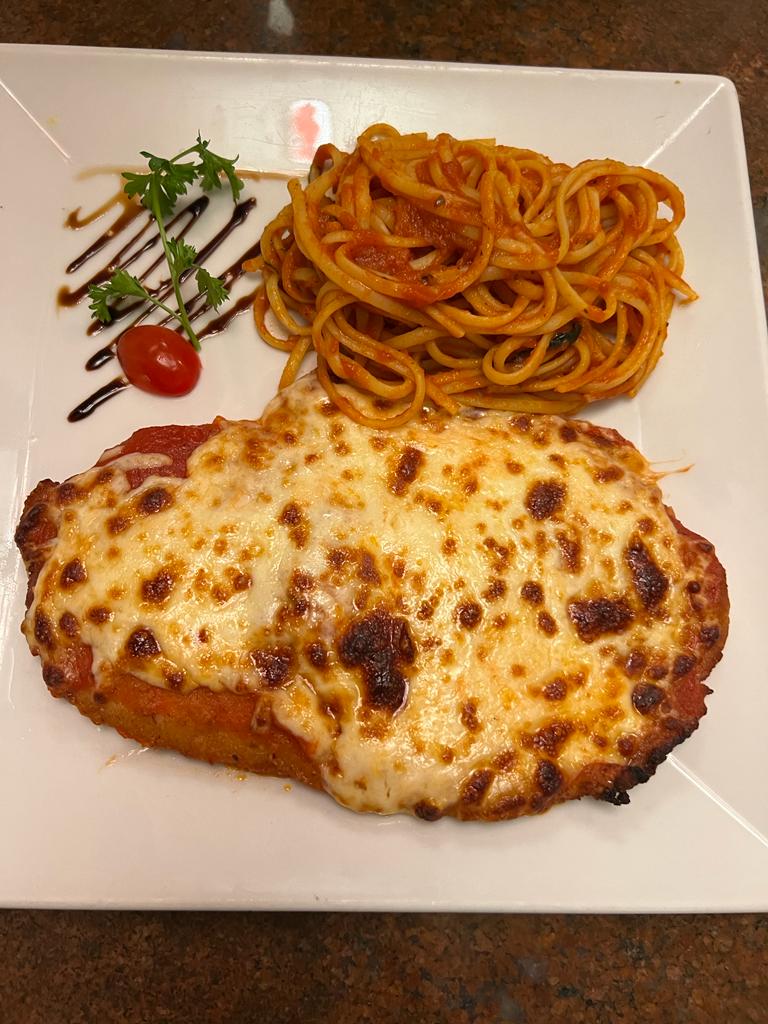 Poitrine de poulet panée avec sauce tomate, Mozzarella, Parmesan, Grillée au four, Servie avec des pâtes aux tomates