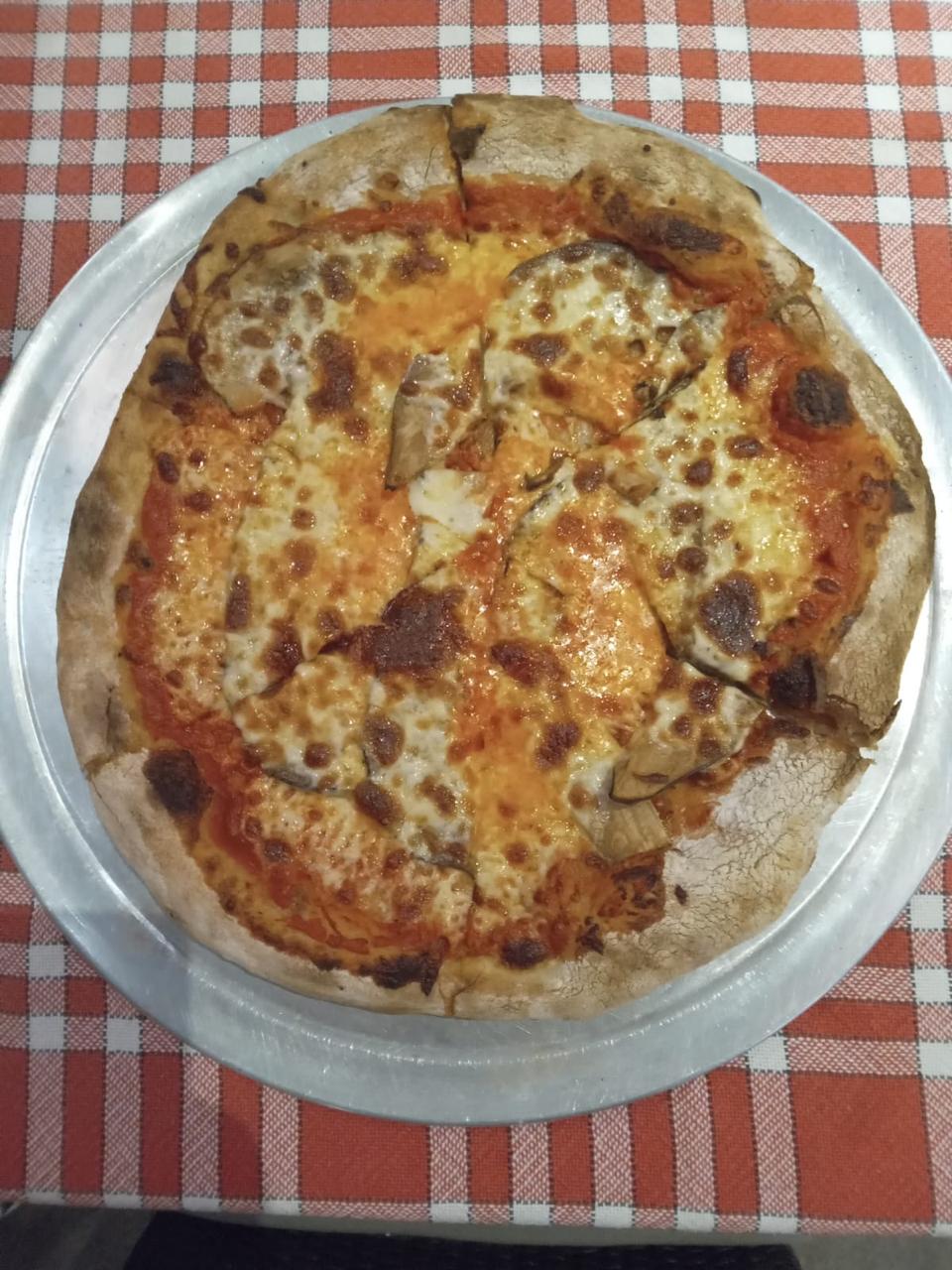 Marinara sauce, Mozzarella, Anchois, Aubergine, Oignons