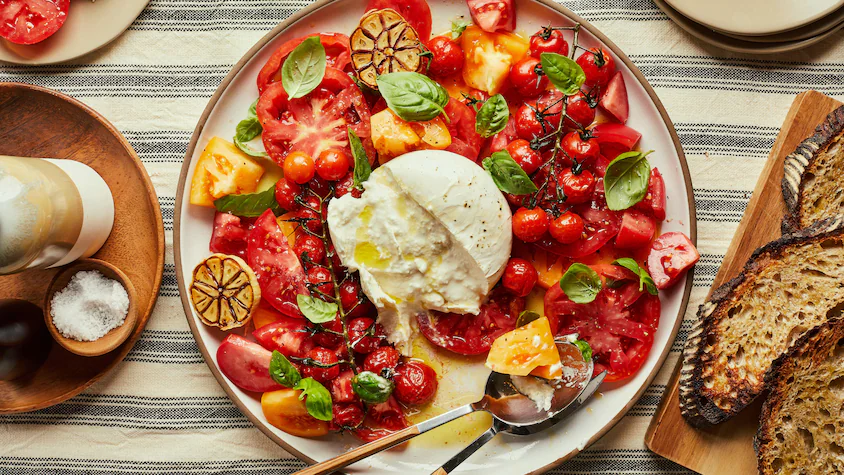 Burrata servie avec des tomates rôties, et tomates cerises rôties, Roquettes, Huile d'olive au basilic