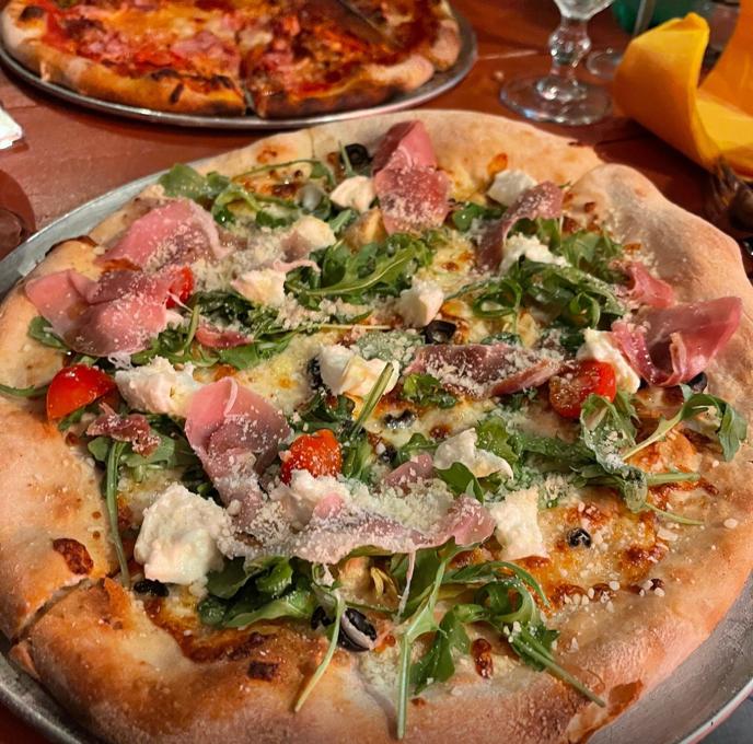 Sauce à l'ail, Mozzarella, Olives, Proscuitto, Fresh mozzarella, Artichaut, Roquette, Tomates cerise, Parmesan