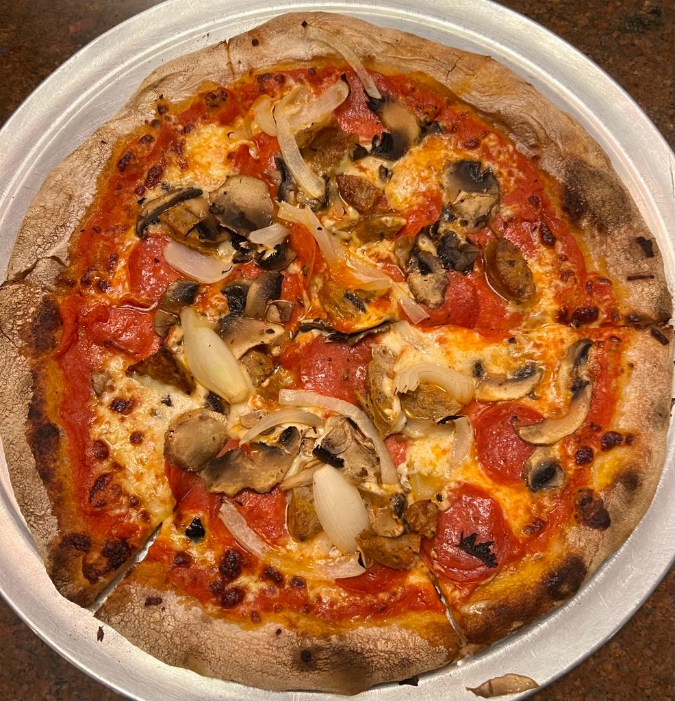Sauce Marinara, Mozzarella, Champignons frais, Saucisse italienne épicé, Peppéroni, Oignons